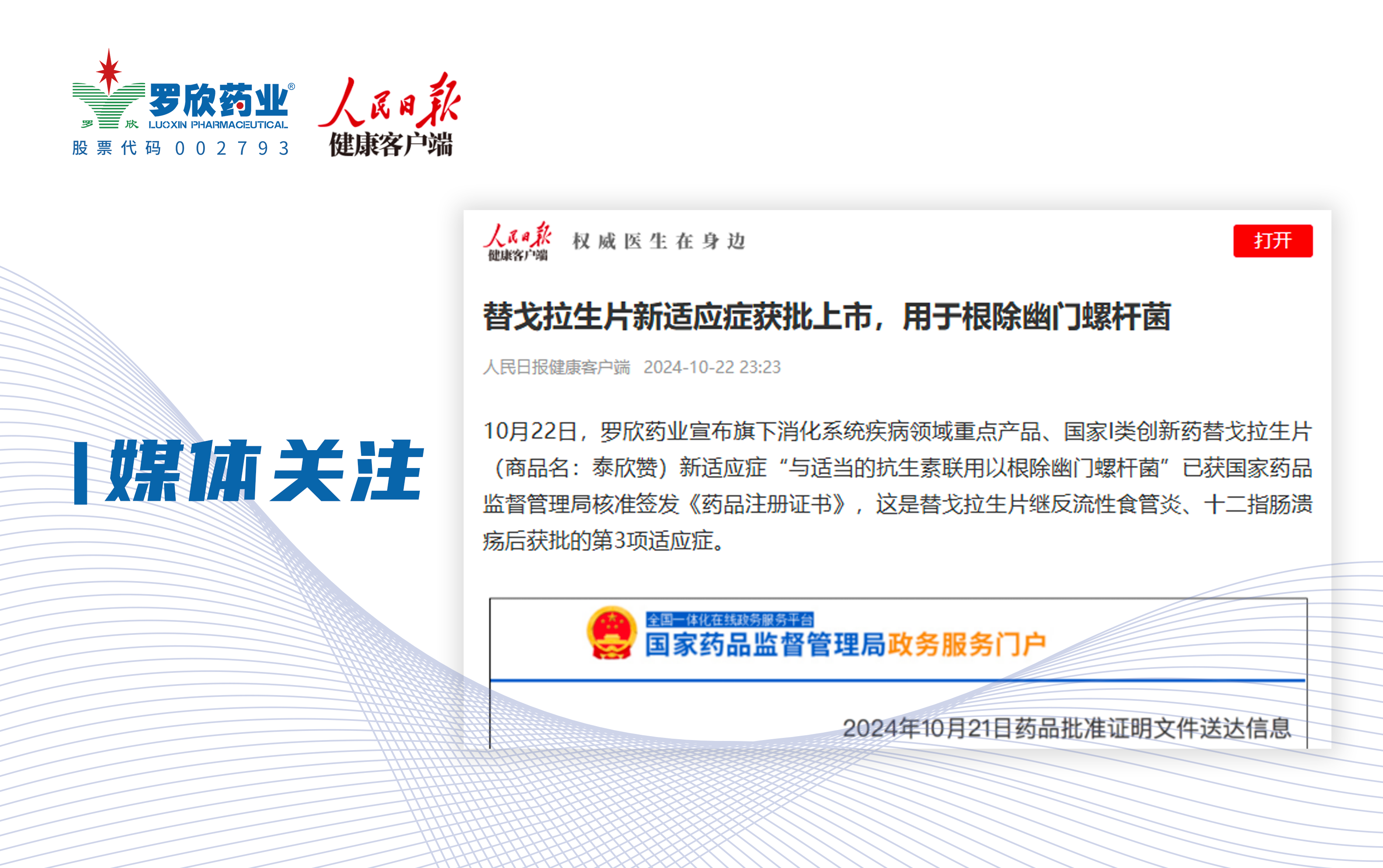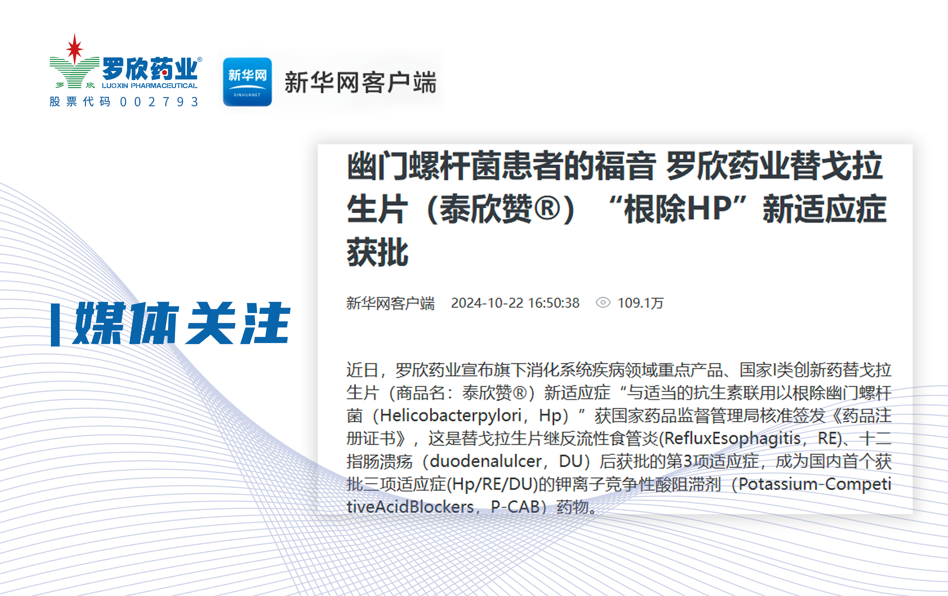 新华网报道|幽门螺杆菌患者的福音 罗欣药业替戈拉生片(泰欣赞®)“根除HP”新适应症获批