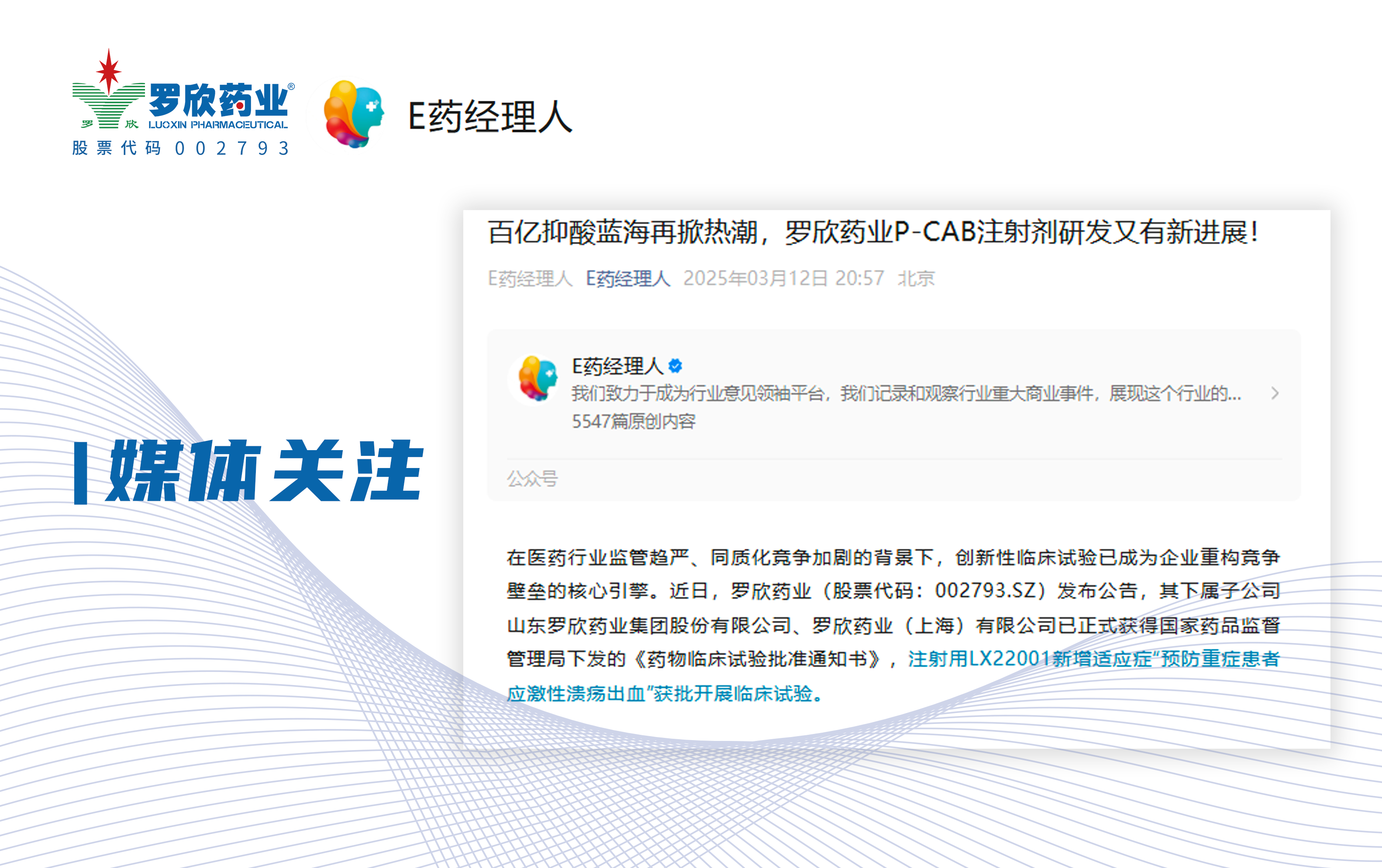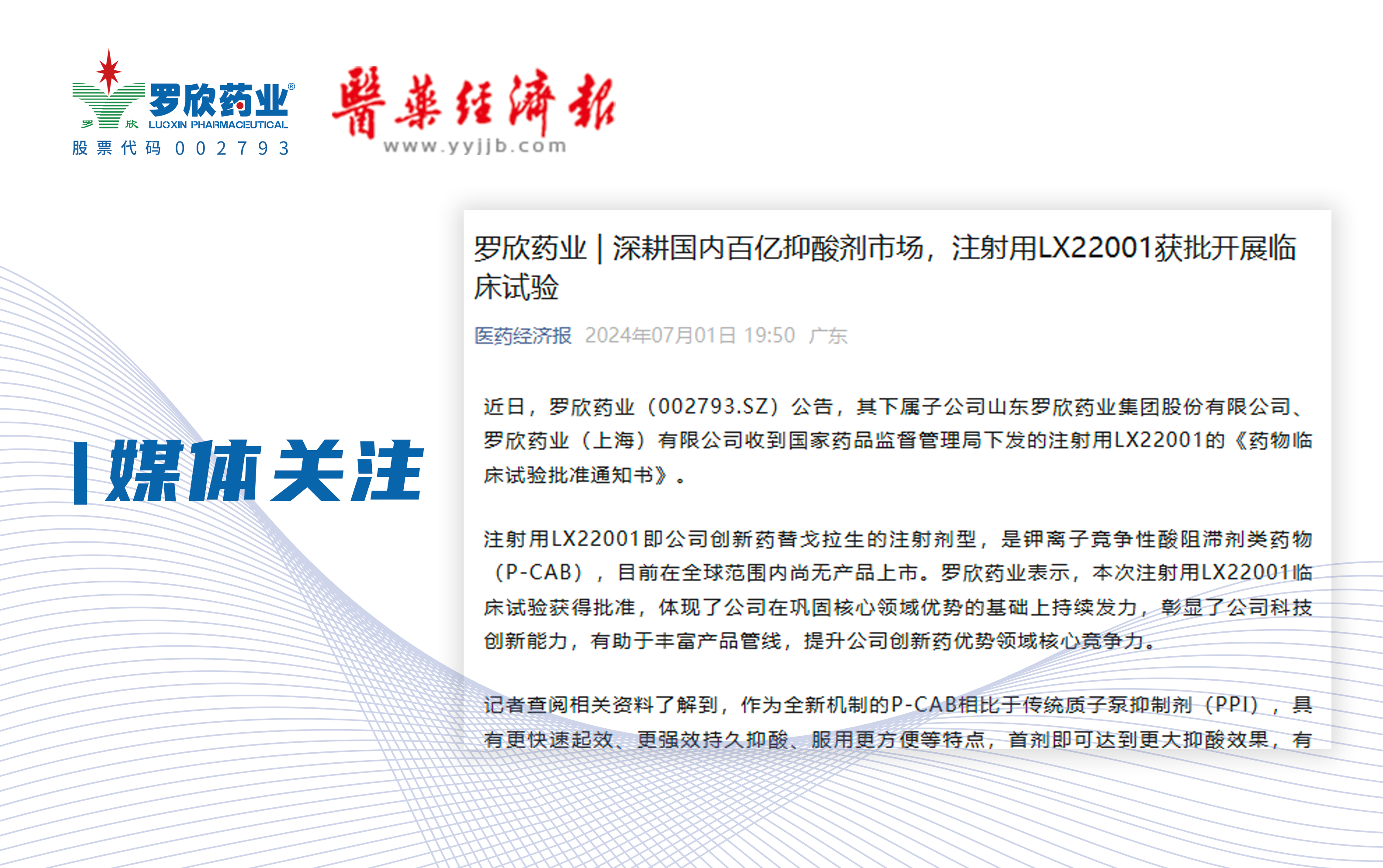 医药经济报报道|罗欣药业深耕国内百亿抑酸剂市场,注射用LX22001获批开展临床试验