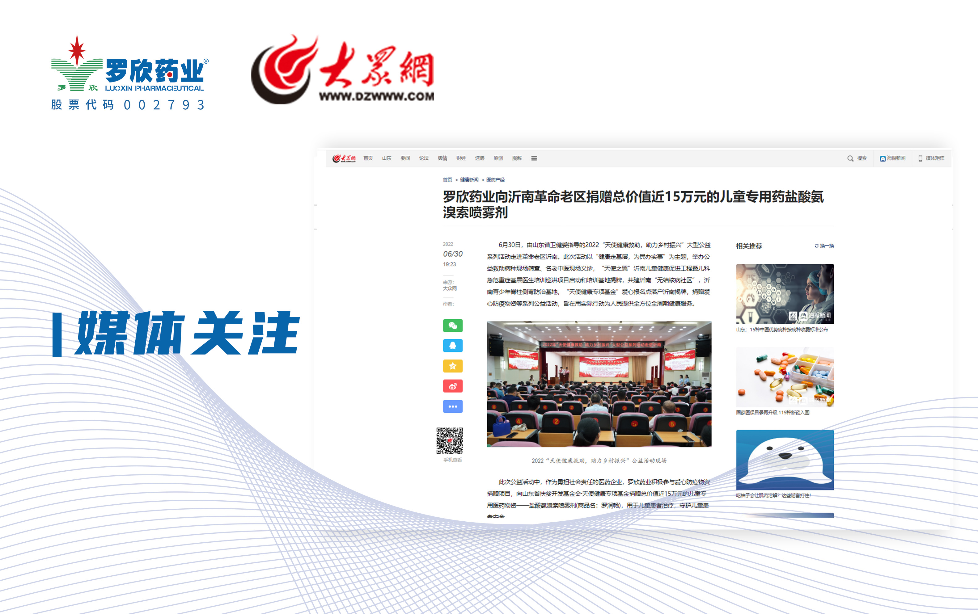 大众网报道 | 罗欣药业向沂南革命老区捐赠总价值近15万元的儿童专用药盐酸氨溴索喷雾剂