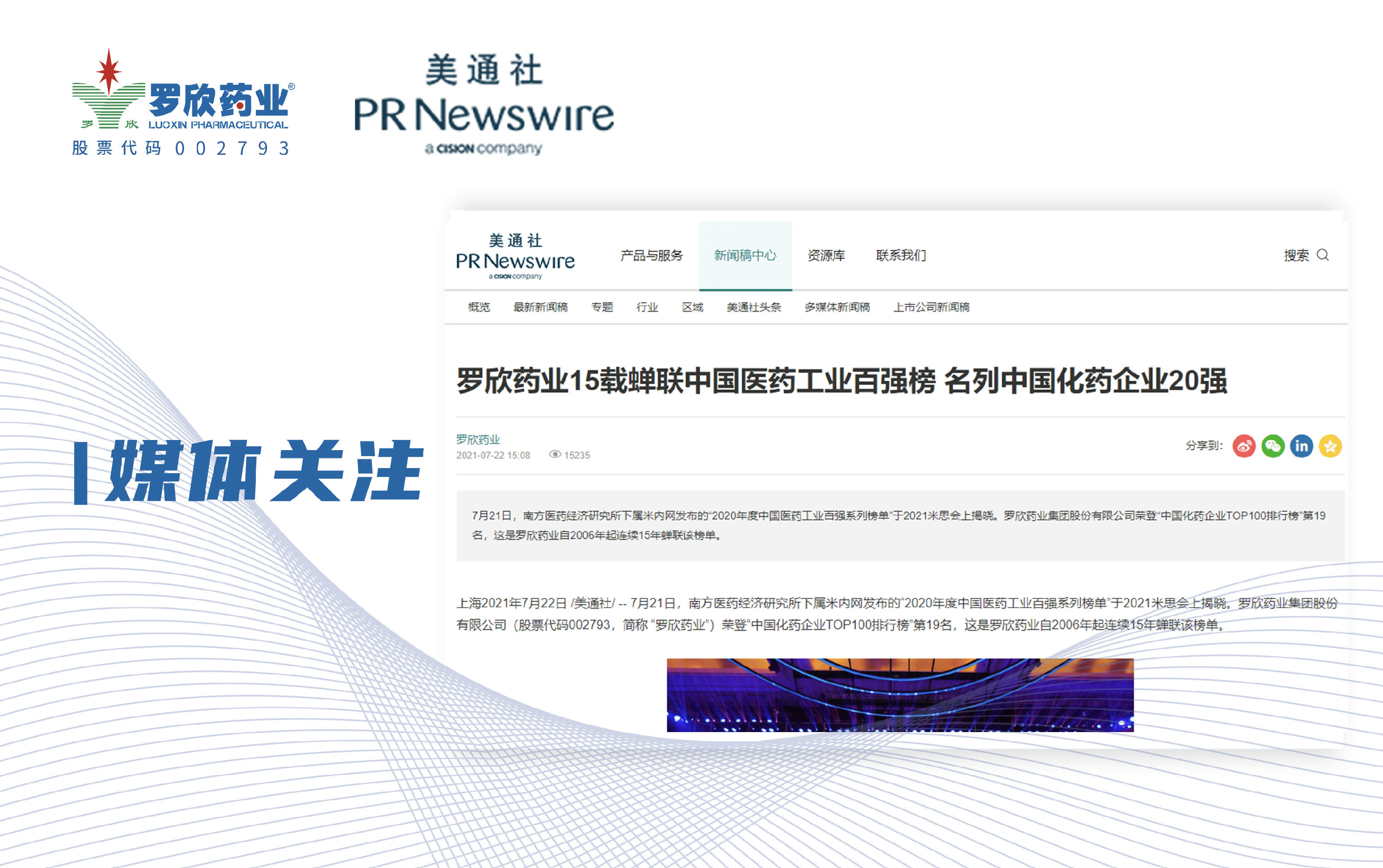 美通社报道 | 罗欣药业15载蝉联中国医药工业百强榜 名列中国化药企业20强