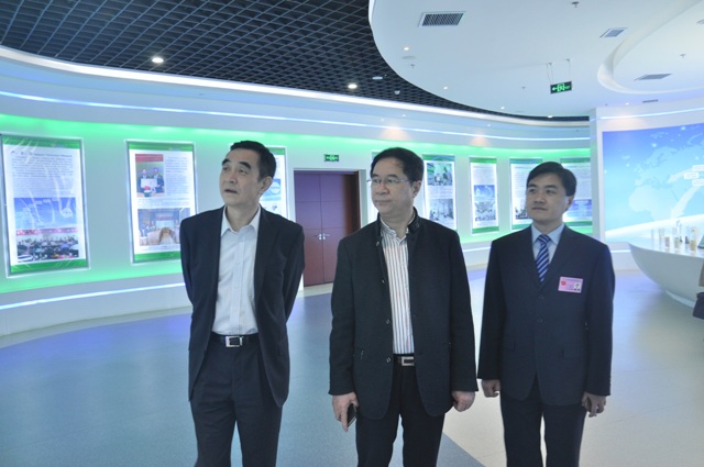 图为中国医药企业管理协会会长郭云沛(左一)一行参观我公司展厅时的情景