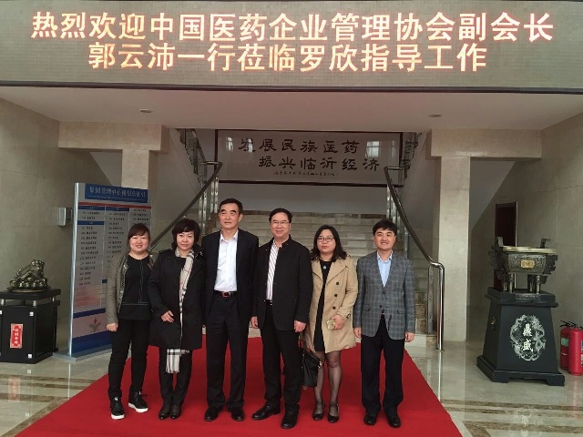 图为中国医药企业管理协会会长郭云沛(左三)一行来我公司指导时的情景