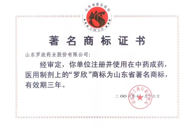 在2006年度的山东省著名商标评选中,山东罗欣的“罗欣”商标被山东省工商局评为“山东省著名商标”,这个殊荣使“罗欣”品牌身价倍增,意味着“罗欣”品牌在今后发展中将更加受到工商部门的悉心保护和消费者的青睐。