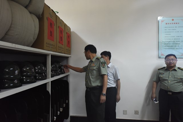 上图为山东省军区办公室主任王建阳(左一)一行参观我公司武装部战备器材室时的情景