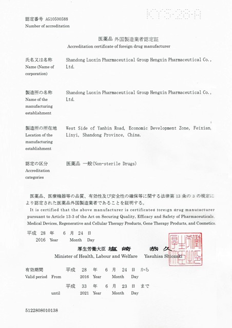 近日,恒欣药业获得了日本厚生劳动省颁发的《医药品外国制造业者认定证书》,这标志着山东罗欣药业集团恒欣药业有限公司的非无菌系列原料药通过了日本AFM场地认证。接下来,我们会陆续进行产品认证MF注册和接受日本GMP符合性检查,将产品出口日本。