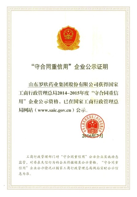 罗欣药业一直以来,将“守合同重信用”作为树立企业形象、促进企业发展的重要工作,认真贯彻相关法律法规,建立健全合同管理制度,坚持“诚信、守法”的经营理念和“艰苦创业、诚信为本、开拓创新、严细守纪”的企业精神,提高企业信用水平,认真履行社会责任,持续向市场和客户提供安全、可靠、高质量的医药产品。