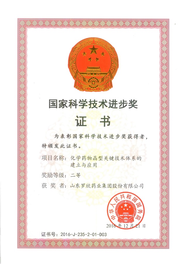 2017年1月9日,国家科学技术奖励大会在北京人民大会堂隆重举行。由中国医学科学院药物研究所、多宝官网等单位联合完成的“化学药物晶型关键技术体系的建立与应用”项目荣获国家科技进步奖二等奖。本项目实现了山东罗欣药业在国家科技奖上的重大突破。