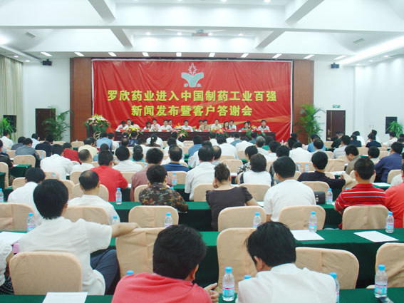 5月26日上午,罗欣药业进入中国制药工业百强新闻发布暨客户答谢会在临沂市南坊新区颐正园宾馆圆满召开。 来自全国各地的300多位供销代表以及临沂市的各大媒体记者参加了这次会议。会上,股份公司总经理李明华女士,就罗欣药业2006年度进入“中国制药工业百强企业”、罗欣药业被国家食品药品监督管理局南方医药经济研究所评为“2006年度十大最具成长力药企”、罗欣商标被评为“山东省著名商标”等进行了新闻发布。集团董事长刘保起先生和临沂市食品药品监督管理局局长崔增久先生分别在会上作了重要讲话。