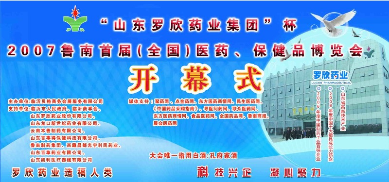 2007年9月12日-13日,罗欣公司参加了在临沂商城会展中心举办的“鲁南首届(全国)医药、保健品博览会”并冠名。罗欣众多新颖的产品,热情周到的服务吸引了众多客商。这场博览会的举办,成功宣传了企业形象,推动了罗欣品牌的提升。