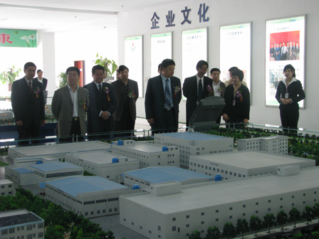 上图为揭牌庆典仪式结束后沈阳药科大学校长吴春福(前排左四),临沂市委常委、市委秘书长李峰(前排左二),市政府党组成员、市长助理宋法亮(前排左三)等领导参观公司展厅时的情景