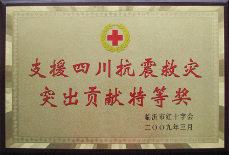 2009年3月,鉴于我公司在支援四川抗震救灾工作中做出的突出贡献,临沂红十字会授予我公司“支援四川抗震救灾突出贡献特等奖”荣誉称号。