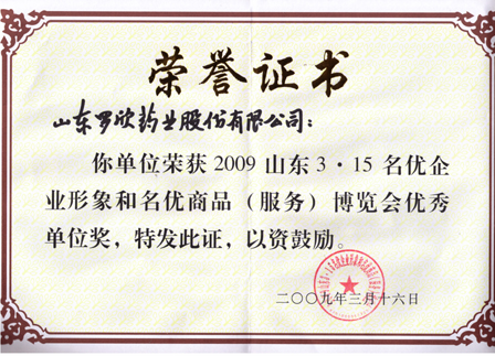 2009年3月15日,我公司参加由山东省消费者协会主办的2009年山东3•15名优企业形象和名优商品(服务)博览会,荣获“2009年山东3•15名优企业形象和名优商品(服务)博览会优秀单位奖”。