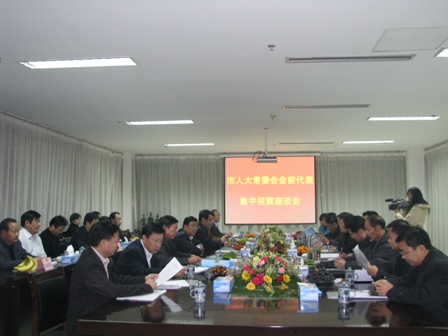 上图为驻临沂市全国、省、市人大代表会前集中视察人员在公司管理中心三楼会议室座谈时的情景