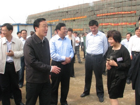 上图为公司总经理李明华(前排右一)在项目建设现场向市委副书记、市长张务锋(前排左二)汇报项目建设情况