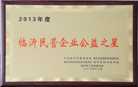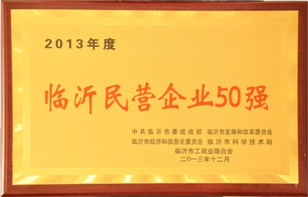 2014年1月7日,临沂市工商联在临沂市政府组织召开了临沂市工商联八届三次执委会议暨市光彩事业促进会二届一次理事会议。大会表彰了全市工商联系统先进单位、个人,我公司荣获2013年度“民营企业50强”、“民营企业公益之星”两个奖项。