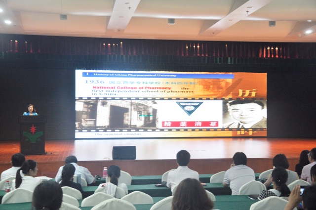 上图为中国药科大学国际医药商学院院长马爱霞在罗欣会堂进行宣讲时的情景