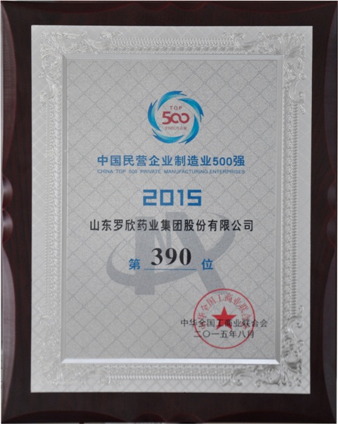 10月15日上午,临沂市工商联“2015年民营企业500强”、“2015年民营企业制造业500强”授牌仪式在临沂市行政中心举行,会上宣布了由中华全国工商业联合会权威发布的2015年民营企业500强及中国民营企业制造业500强排行榜。我公司荣登中国民营企业制造业500强排行榜,位列第390位。入选此榜单显示了我公司不俗的综合实力和创新能力。